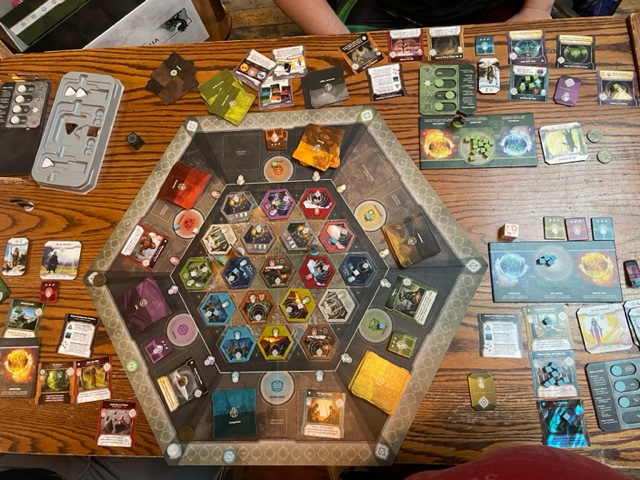 The beer and food are great; I will use that as my excuse for inattention and placing last. Corwin, who had not played for a few years, still had the rules down cold. He was near the Arcane Tower location (all locations are randomly placed as the players explore the island) and had a companion that reduces the cost of Artifacts found at the tower; thus, Corwin had three artifacts by the end of the game worth a pile of honor points and gave him all sorts of superpowers. Corwin and Evan both fought monsters for another pile of points.