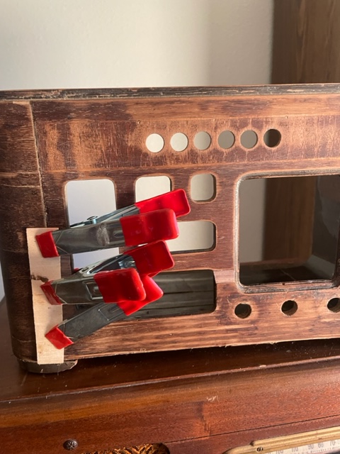 Before this, I repaired more missing veneer (a tiny piece but noticeable) on the wooden radio box. I also reglued (white glue) the delamination of the curved edge. I will fix the other side next. That is the final step unless I decide to fix a few minor veneer losses. I received the new see-thru precut plastic for the faceplate area (the old plastic is discolored and partially melted). It was a bit too large, but I used my mini belt and disk sander to reduce it to fit the space. It took a few passes, but it works well now. I will glue it in place with see-thru white glue after I paint the frame carefully with some brass paint that contains wax so it can be polished like natural brass.