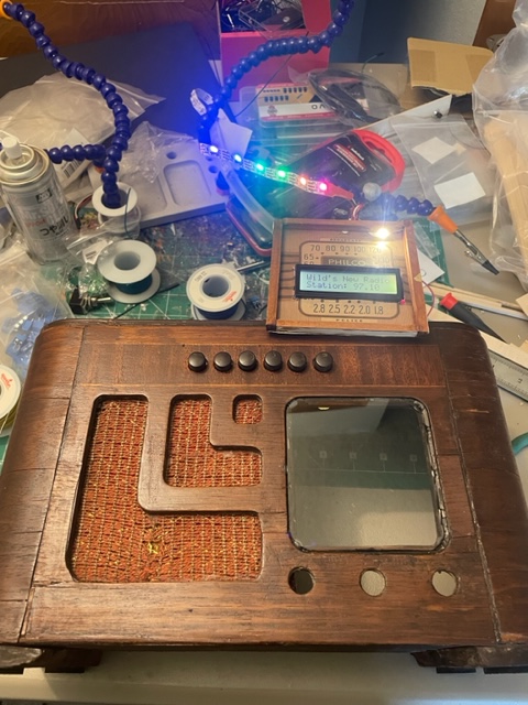 The radio with the original buttons restored to their original location. The new window is done, and the cloth is reattached. The new faceplate (actually paper) with the new LCD mounted and LED (which will be less bright when in the box) are all visible. The strip of colored lights will be behind the acrylic replacement to be a light show. The veneer replacement/repairs are visible.
