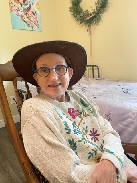 Susie had just finished her breakfast when I arrived and was moved (Anassa is the weekend nursing aide) to her rocking chair in her bedroom. Susie is delighted to see me but is confident she does not want to try the misty Metzger Park next to the hummingbird house. Susie’s room has a window that points to the park, and she sometimes watches the basketball court not far from home. Susie can see that the court is still wet and covered with a few puddles–no, we are not going out there.