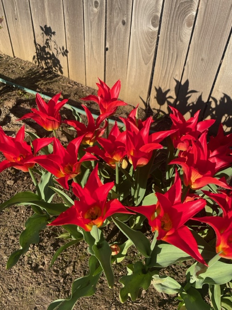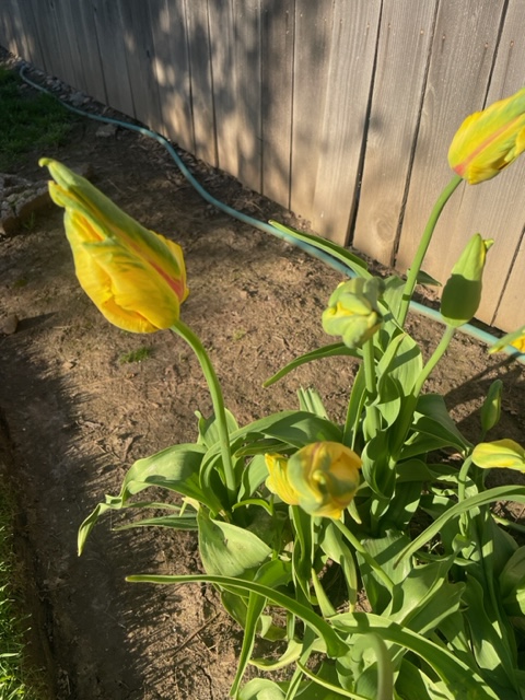 My fancy yellow tulips have bloomed, and my red Turkish-like tulips are still a splash of color.
