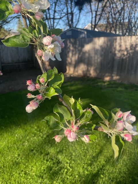 The apple tree (not Apple but apple) that fell over and has been pruned back into a tree shape is also flowering.