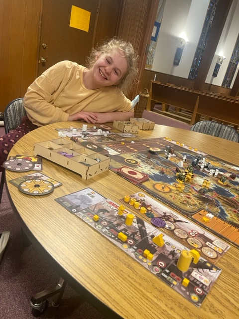 I rest and then head to First United Methodist Church to meet Dondrea and Z for a board game. Z and I agreed to do Scythe, a 4x and thus a very competitive game set in an alternative steampunk world where the world wars did not happen. Z surprised me by remembering much of the process, but as we have not played it often, she did not have a strategy down. I spent most of the game developing efficient processes that drove a score of 51, and I won by twenty. Z was beginning to figure out the game, but it then ended. I remember when it was newer to me and having the same experience. She is ready for another game.