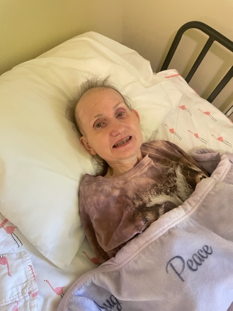 We called her mother, and they briefly chatted while Leta was getting her lunch/dinner at Panera Bread. Susie could wake up enough to talk to Leta for a few minutes. Soon, after ringing off, Susie was sleeping while M.A.S.H. played on her TV in her room. I stayed until noon as she likes to sleep with me there–it makes her comfortable not to be alone.