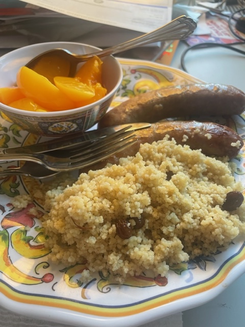 The water still works; I checked. Then, I turned on the oven and baked the bratwurst. I had the sausages with the leftover couscous. I found 1/2 a can of peaches also leftovers, put them in a bowl, and had them instead of making a veggie. I missed the charcoal taste from grilling the bratwurst, but I could read and rest while they baked, and they came out perfect after about an hour at 350F. So easy!