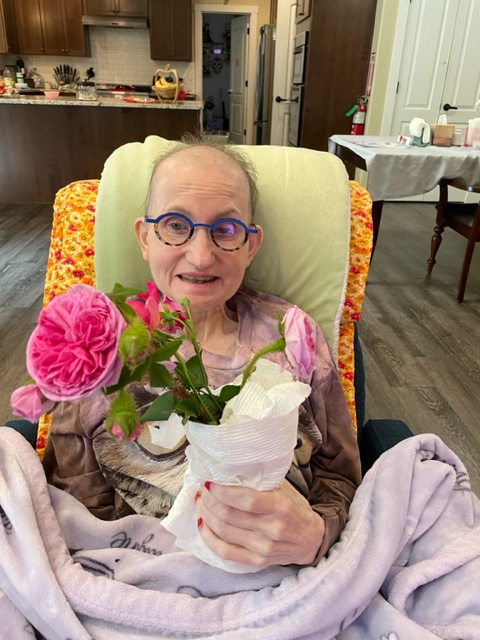 With the crisis likely over (until another one surfaces), I headed outside and rediscovered why one should use gloves when cutting your roses. The English rose, The Herbalist, has hypodermic sharp thorns–I was reminded when I went to add the rose to my cuttings! The old rose pink moss’s (a lovely but once-blooming rose) moss had hardened from the hot days and stuck me a few times. China rose, a very old, continually blooming rose, had politely pointed down thorns. With a small collection (and a bit of pain), I boarded Air Volvo and headed to see Susie at the hummingbird house in Portland (Tigard) at Allegiance Senior Care LLC, 9925 SW 82nd. Ave. Portland (Tigard), OR 97223; phone (503) 246-4116.