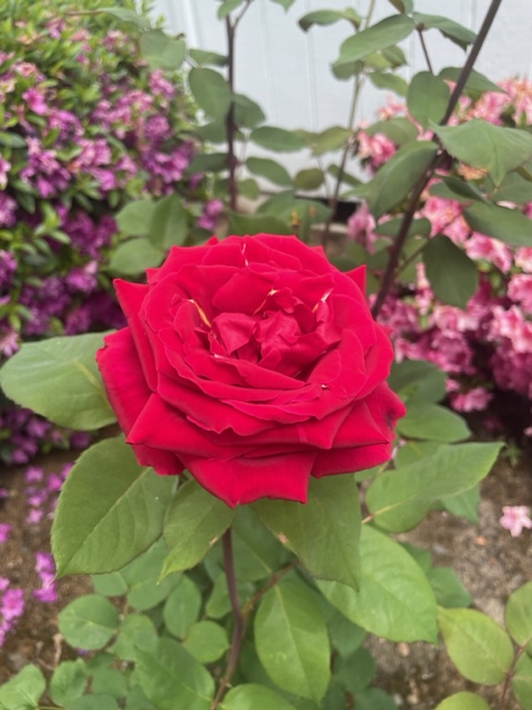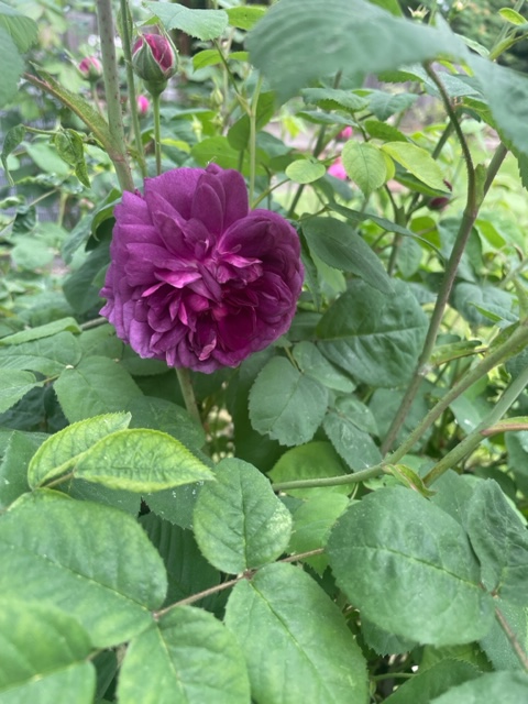 The Cardinal Richelieu has also bloomed. It is showing less stress. The watering and fertilizer helped. An near impossible-to-find once-blooming rose from the 1840s.