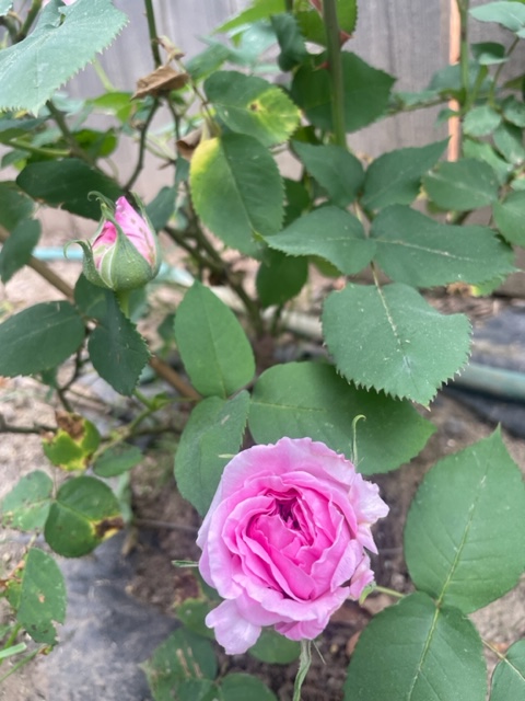 Souvenir du Président Lincoln is also blooming. The first time for multiple blooms, and planted last year. This is a bourbon rose from 1865. You can see a little of the black spot stressing it. It needs more watering.