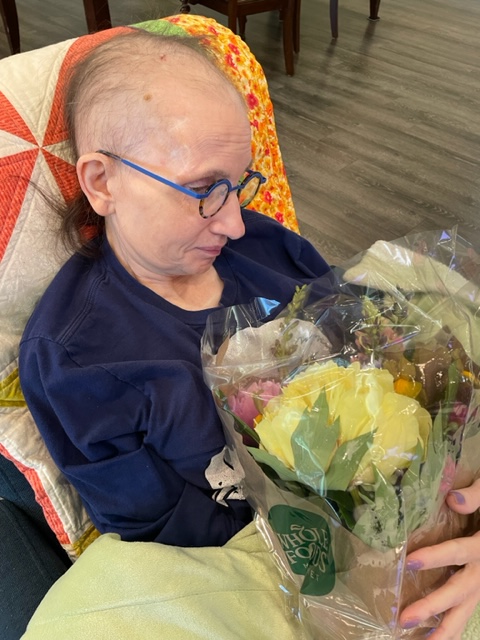 The trip there was not memorable, which is a good thing, and I arrived there without incident and in light traffic. Susie was in her recliner in the shared main room, napping. I woke her and brought her the flowers I bought at Whole Foods during yesterday’s grocery shopping. Susie was delighted to have a visit and loved the flowers.