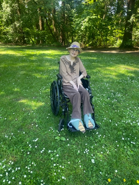 Susie had just finished lunch when I got there, and Susie was still in her wheelchair and delighted to see me. We headed out to the park. It is sunny and about 80F (27C) at noon with a nice warm breeze. The park was full of families with small children. School here is on for another two weeks. We enjoyed the park and watched the butterflies dance (four Oregon Swallowtails). The park manager spoke to us about the hot weather and the cedars’ stress. They expect to lose two more this summer–unfortunate. A young man had smashed his beer and was sternly reminded to pick up all the pieces by the park manager–We can’t have little kids cut their feet on broken beer bottles! The message was politely received, and the clean-up was done.