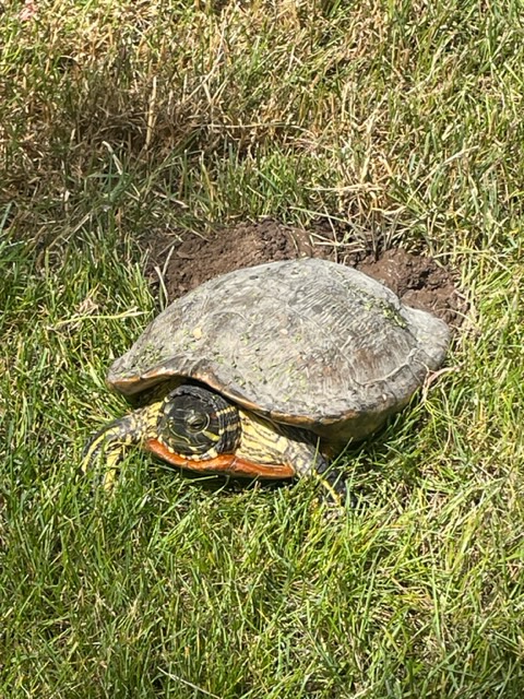 I spotted the large foot-long turtle on my neighbor’s lawn laying eggs. The turtle is an invasive species (it has a red stripe on its neck, meaning it is not local), but I cannot kill it–it is too cute and big. It was someone’s pet that they illegally let loose in the local waterways, and it has thrived. I have never seen the eggs hatch, but I assume they must hatch, and the tiny turtles must reach water or be lost to predation.