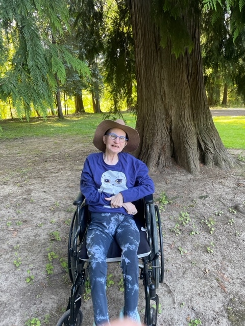 I head out before 1PM to see Susie at the hummingbird house in Portland (Tigard) at Allegiance Senior Care LLC, 9925 SW 82nd. Ave. Portland (Tigard), OR 97223; phone (503) 246-4116. Hall Boulevard is still closed, but the detour is faster this time–Next time, I will avoid Hall Boulevard. When I arrive, Susie is asleep in her recliner in the shared living room. Jennifer, the weekday day nursing aide, says Susie ate well but was tired again. Susie was sleeping through Harry Potter, her favorite.
