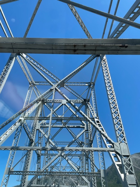 Just as I was wondering what I had done wrong, the sign for The Bridge of the Gods appeared, and soon we were slowly climbing the two-lane, no shoulder, no walkway, 140′ +/- above the Columbia River bridge. The traffic clogged the bridge, and we got to sit on the bridge for twenty minutes. When the U-Haul went by, the bridge did spring a bit–causing eye rolling from me. The higher roadway is metal grids and thus is see-through–a feature I did not appreciate as we moved slowly toward the toll booth–an impressive view straight down. Susie loved the view, and I took pictures as there was little more to do than creep across the metal grid and bounce when oncoming traffic heavy trucks passed.