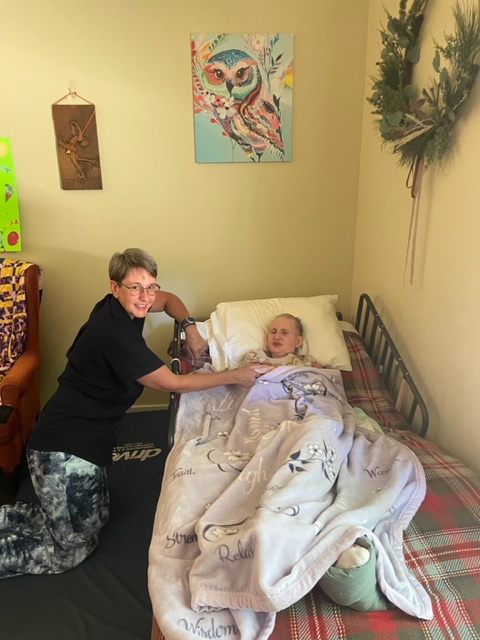 Susie got her bottom sore when sitting for a few hours, and we retired to Susie’s room with Jennifer putting Susie on her side, and I started M.A.S.H. We chatted and watched M.A.S.H. until dinner time.