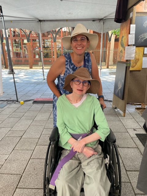 Susie was still finishing her breakfast when we arrived, Barb arrived before me, and Susie was ready for her next adventure. Michelle Nixon came today and met Barb and was happy to see us. Anassa, the weekend nursing aide, got Susie prepared with sunblock and shoes (Susie’s yellow shoes were too tight, see we changed to her flower design Nikes) and popped Susie into the copilot seat on Air Volvo. Barb was in First Class just behind us. We traveled from 217 to 26 to Portland, and then I parked in the Burnside parking near the Saturday Market. Another car pulled out from a large spot next to the trash bin, so I parked there. I pulled in 1/2 way and unloaded Susie after reassembling the wheelchair from the cargo hold. Once Susie was safe, I pulled in the whole way, scanned the QR code, filled in the information, and paid for parking, even on Saturday.