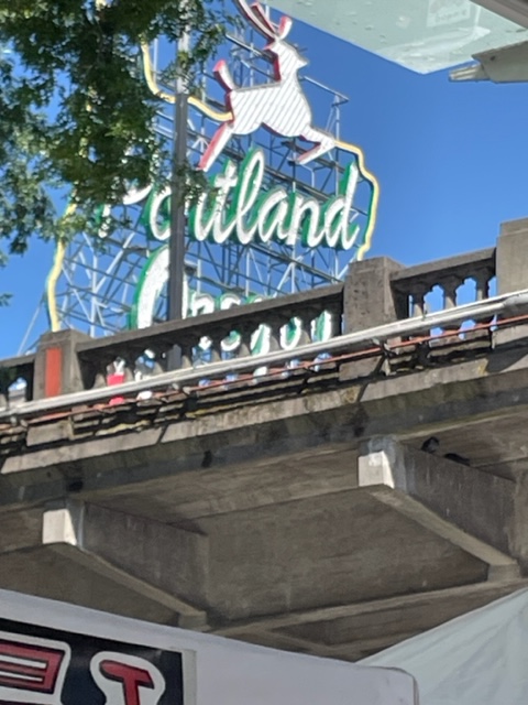 Barb shopped and found items for her kids to take back. Together we explored the slowly heating cityscape of tents and booths selling various edgy handmade or printed items. The smell of pot was only in a few places, and the bongs and other drug items, with the decriminalization of almost everything in Oregon, seemed no longer edgy, were missing, and indeed not central in any display. Instead, food products, soap, and cat toys were more pronounced, with rainbow colors being the most used decore for stands. There was a booth to buy a dart to throw at a picture of Trump and DeSantis, pride project funding booth. Portland has mostly moved much that was radical to the mainstream.