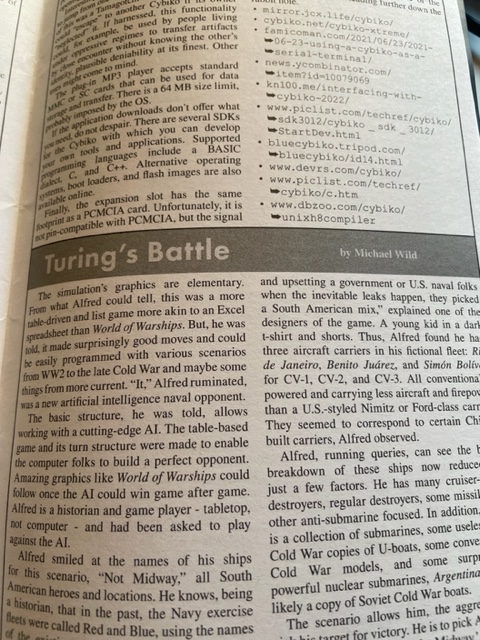 I reread it, and the editing, if any, was light, and the whole story was there. I originally wrote it for the Navy Institute, was rejected, and then sent it to 2600, who accepted it almost immediately. It is a story about Artificial Intelligence (AI) written a year before the panic you see now. This 2600 issue has an editorial about AI, and I suspect that is why they moved my story to this issue–there are quite a few AI items in this quarter’s version. I was excited and happy to finally get something out.