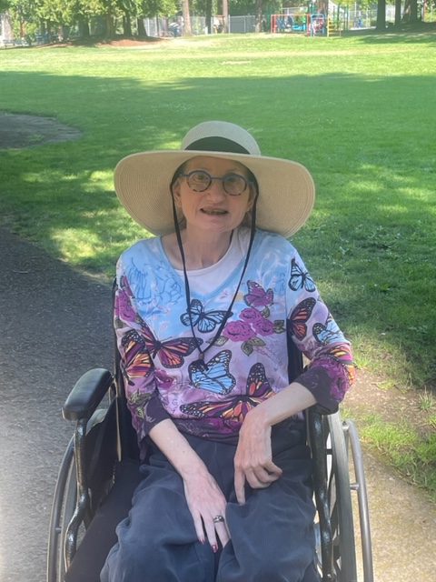 Next, Anassa popped Susie into her wheelchair so we could visit the park. The park was still excellent, under 80F (27C), and we parked at a bench and just watched the folks for a while. The yellow jackets were willing to be waved off today. We enjoyed just relaxing in the park. We did tour the roads and looked at the roses, fruit trees (now loaded with fruit), and the magnolia tree (one big white flower near the base). After that, it was time for me to go. Susie was happy to be placed in the recliner (Louis, the evening nursing aide, did pinch his hand in the recliner–I did not warn him in time; it is tricky).