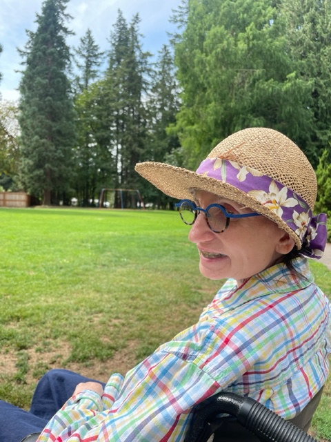 Before all this traveling in Portland, I was at Susie’s in the morning, arriving before noon. The weather was overcast and humid. The 80Fs (27C) should not feel cool, but anything felt cold after three days of 100F+ (38C) days. Jeniffer popped Susie into her wheelchair from her recliner in the shared living room, and I soon pushed Susie into Metzger Park next door. Susie was happy to again be back to our park visits.