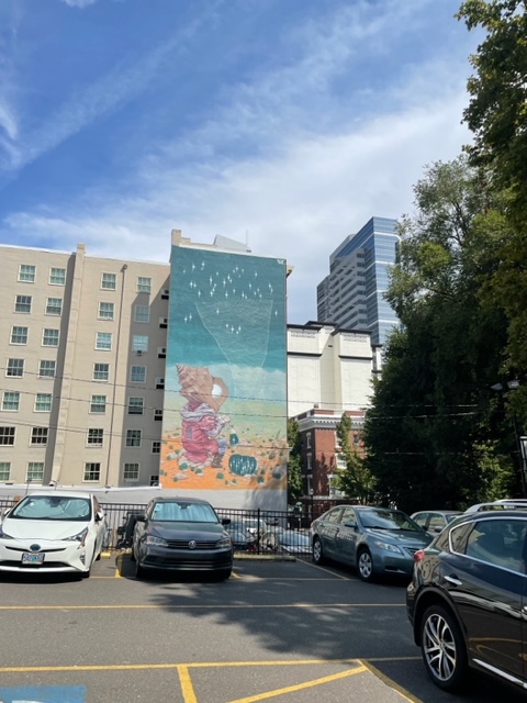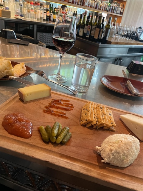 Next, I stopped by South Park’s bar–A place Susie and I used to visit after symphonies in the nearby Arlene Schnitzer Concert Hall. The place has been remodeled (I learned that the art pieces are at the former wine bar director’s wine shop), and the menu is a bit less friendly, I thought. I managed to order an excellent red wine–but the bar no longer focuses on wine, I could see, and instead had the usual endless spirit collection. The bartender was not that helpful. I had to pick it without recommendation (I miss Will, the aforementioned wine bar director). I had their board of cheeses and some fish dip for their house-made crackers. The mains ranged from low thirties and up to $60+, but they still had fish and chips and a burger for a reasonable restaurant price. No special bar menu with special appetizers like olives or stuffed dates. Still, it was good, and the bartender, Matthew, ensured I was happy.