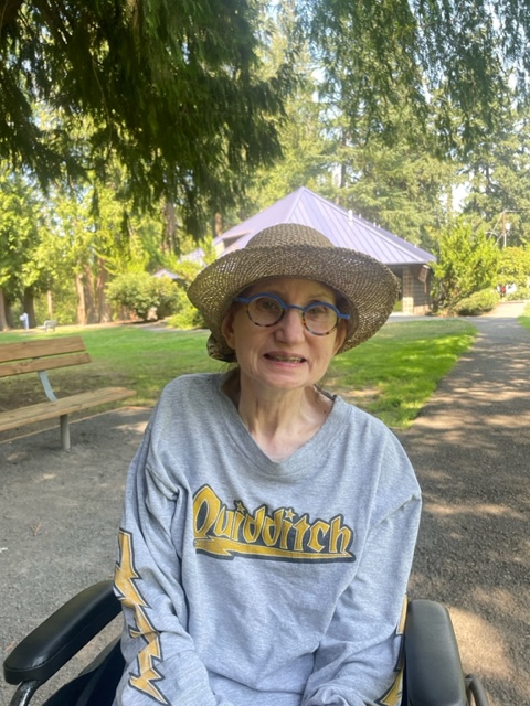 Susie was in her recliner in the shared living room when I arrived. Jennifer, the weekday nursing aide, popped Susie into her wheelchair. We then headed to Metzger Park with the light again clear and white (not the yellow color we see with the smoke). We sat on the shady bench by the cedars and redwoods. Using FaceTime, I called Leta and Barb (Susie’s mother and sister, respectively) on my iPhone to form a three-way call. Everyone was happy to see each other and us out in the park. The park was busy but not packed like it was on the weekend. We had a friendly chat and then, after ringing off, finished the loop through the park and back to the hummingbird house. A yellow jacket wasp did land on Susie a few times, but I managed to wave it off before it did any harm.