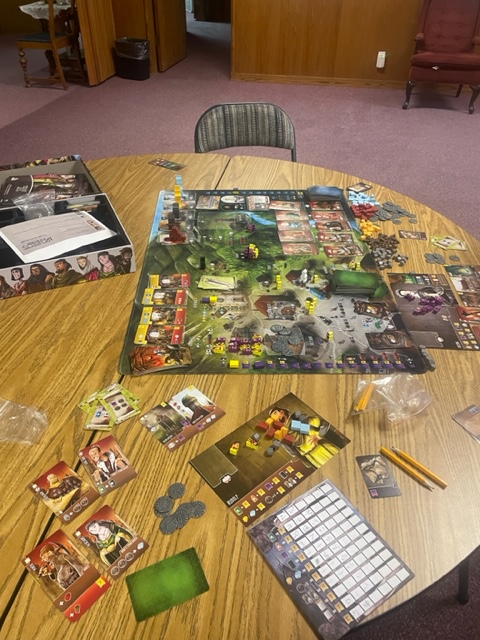 Z and I set up Architect of the West Kingdoms, and Z immediately started to execute a plan. She collected all the resources to build the cathedral and then just built every level earning twenty victory points. I built all the levels left and some more buildings, but I could not catch Z. Z got a few more buildings built and crushed me by about ten points.