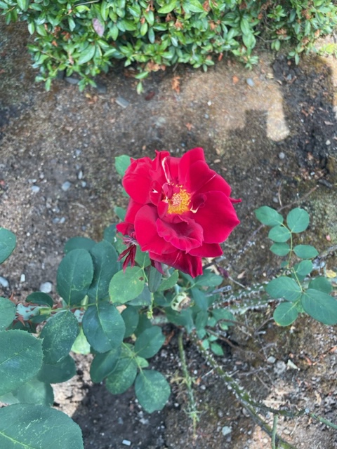I discovered a bloom on Mister Lincoln; a bit heat-stressed but still lovely.