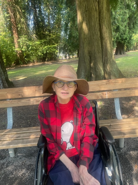 Susie was happy to see me, and we soon were enjoying the clear, warm day, almost 80F (27C) and still slightly humid. The park was not busy except for the usual dogs walking their humans and a fly that loved Susie and me. It would not go away. I found my favorite bench not in use, and soon, I occupied it with Susie next to me. We called Leta and Susie’s sister (mom and sister, respectively) on the iPhone and soon reached both to form a three-way call. Everyone on the call was cheerful, and we discussed some of my travel planning. Susie was tired and falling asleep in her wheelchair–she was fighting, I could see, to stay with us, but Morpheus could not be resisted. Susie was leaning forward, a hazard, and soon, we ended the call. I made the usual tour of Metzger Park, and we were chased by yellow jackets at one place with the wasps reacting to the spinning black wheel spokes (wasps don’t like things black and moving). We and the wasps were undamaged.