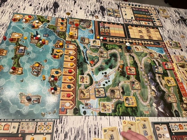 Ostia is a resource and worker placement game with the Mancala driving your turn. You pick an action and then drop your ships around a port; the last ship placed gives you the second action. This means you need to think a few moves ahead. A main board is for exploring and capturing more options and resources. It took a while for this very different process and some anti-intuitive interactions to work into our thinking. I like the game, and it does not play too long, a feature I have begun to appreciate in many complex games. I won, but Evan was still trying to remember the rules so one does not count.