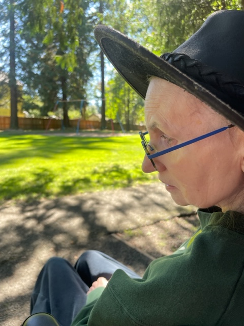Next, skipping work, I headed to see Susie in the late morning but had to travel across Beaverton instead of using the usually fast Highways–they were backed up by constructions. I got across Beaverton faster this time and soon was with Susie. We headed to Metzger Park next door and found a bench for me to sit on while we called Leta. Leta, Susie’s mother, was happy to connect with Susie, and we talked for about ten minutes.