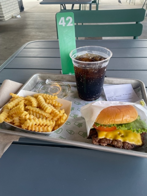 The next event was lunch and dinner in Beaverton. I had a fantastic Brie and Apple sandwich from Paris Baguette (Beaverton), a chain I enjoyed in New York City. I got this on the way back from Susie’s place at Allegiance Senior Care LLC, 9925 SW 82nd. Ave. Portland (Tigard), OR 97223; phone (503) 246-4116. Dinner, after leaving work today, was at the Shack Shack, and a colorful gal with many piercings who took my order suggested it: Shack Burger with avocado slices. I was order number 42, and remembering my Douglas Adams, I obviously had the ultimate question burger.