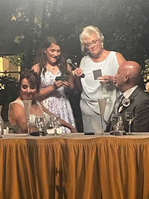 Returning to the narrative and moving back further in the day, I was in the wedding party, so I had some duties and many required pictures that kept me busy. I did forego giving a speech. Leta was comfortable to watch, and Mom Wild had to be in many photos, too. The food was all finger food and dainty mains for an evening wedding, avoiding the complexity of a sit-down dinner while still being elegant and delicious. Each place setting did come with a small bottle of bug spray, which was liberally applied by most as the night went on. Meg, Jesse’s 12-year-old daughter, was included in parts of the wedding ceremony to show that they were all a family together now. Leta said it was a beautiful wedding.