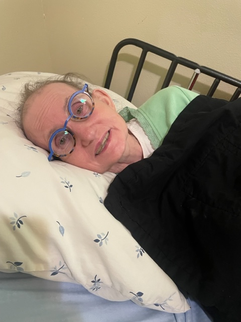 I had no traffic or issues when traveling to Susie’s place at Allegiance Senior Care LLC, 9925 SW 82nd. Ave. Portland (Tigard), OR 97223; phone (503) 246-4116. I was there a bit late, almost 2PM, and I found Susie resting in bed. She was delighted to have me visit, and we soon called Leta, Susie’s mother, on my iPhone using FaceTime–we like to see each other. We had a quick phone visit. After that, Susie signed a birthday card for Barb (Susie’s sister) and Barb’s husband, Gordon.