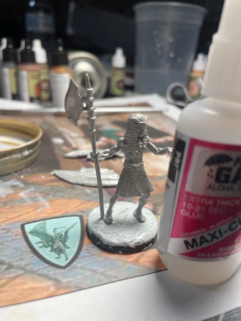 I wanted to paint a unique figure for Friday’s Dungeons and Dragons game: I have a sizeable Egyptian-style guy that would be perfect. I got the figure from the UK, Otherworlds, as part of a Kickstarter campaign to re-writing the old adventure, The Dark Tower: Accursed by Set, as a 5E new-style adventure. Otherworlds created figures to match the adventure. They were not cheap, and I ordered quite a few to match some of the unique creatures from the adventure. I played the original version in the 1980s and thought playing in a 5E game would be good. While I have the figures, I am still waiting for the actual adventure from Goodman Games.