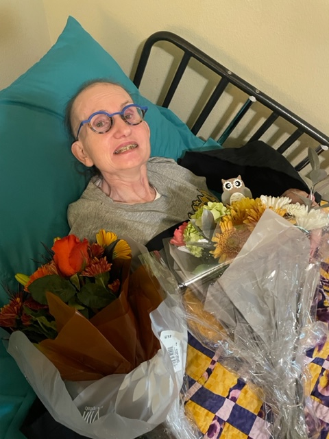 Returning to Susie, Susie was resting and watching M.A.S.H. but was happy to have me visit. Using FaceTime to form a three-way call, we called Leta and Barb (her mother and sister, respectively) on my iPhone. Barb was sitting on her deck in Michigan relaxing on the hot, 80F (27C), and humid Michigan fall day. Leta was inside, sitting in a chair and relaxing in the AC. We talked briefly, with Susie “resting her eyes” a few times. We soon rang off. I stayed the afternoon with Susie.