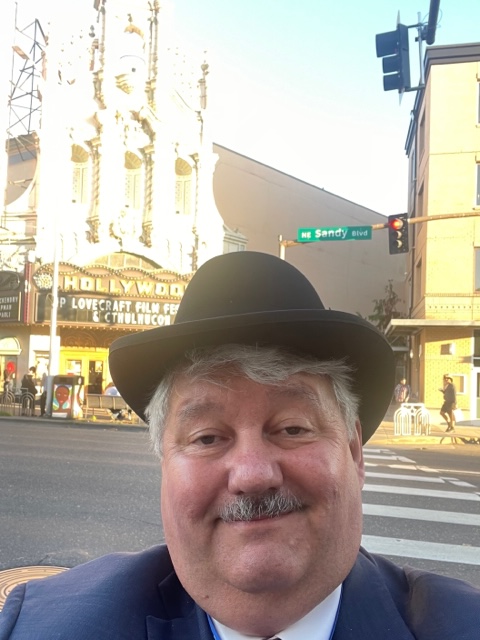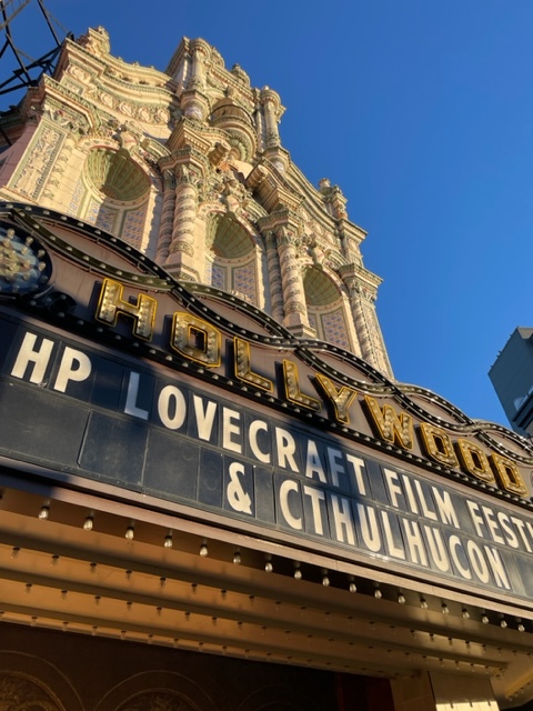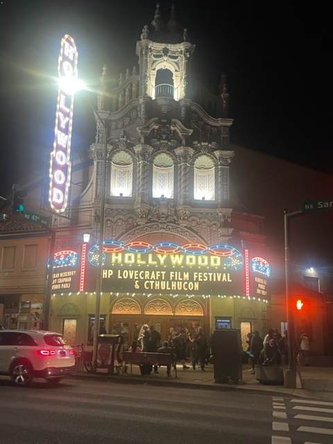 After paying for my repast and finding some writers selling their books (I bought two hard copies from the various writers), I headed to the Hollywood Theater. I soon had my left side, three rows back, with a perfect view for this showing. Placing my Homburg on my seat, I got my goodies for the Kickstarter. Found beer and popcorn and set that safe in my seat and the next seat. Ready. It is a polite group of cultists, and just putting your hat on the seat is good enough (it will be there when you get back, and nobody will take your seat).