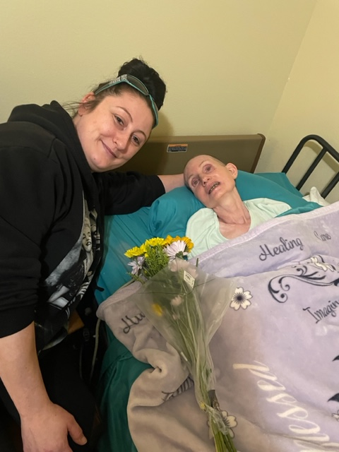At about 8ish, Anassa, the weekend nursing aide, visited after driving from Salem. She brought some flowers, and we sent her daughter a rose from Susie’s flowers. Anassa had a pleasant visit, and I took a picture. It was the first time I saw Susie smile today!