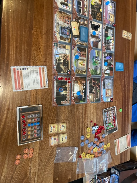 I have the Big-box version that contains all the add-ons, but we played the base version in the first game. Evan soon remembered how to play and did well; he was one ruby (the game is about managing resources and position to get five rubies–for two players–purchased with various resources) when I won the game by getting my fifth gem–the gems are little pretty rough red plastic bits. We reset and added in the Mocha & Baksheesh expansion, which makes the game a bit slower and provides coffee as an additional resource and four more locations. The game changes from good to excellent with the expansion. Planning and a winning player must do things that help you gain gems in multiple ways. I won by two gems in a fast-learning game. With more beer and some food, we decided to play again. This time, Evan pushed me pretty hard–he used coffee and some resources to use Baksheesh to generate a gem about every fourth play. Still, this highly caffeinated plan was not as fast as collecting various resources and using the resources to gain gems from the Mosque locations and the Sultan’s Palace, and selling resources at the markets to make cash to buy a gem (look, I wrote a Lovecraft-like sentence–long). But it was close, and Evan managed a fifth gem on his last move (the round is completed when someone gets the last gem), forcing an opening of the rules. My pile of remaining coins gave me the win as a tiebreaker. Evan was disappointed as he thought he had me–but it was an excellent game played well.