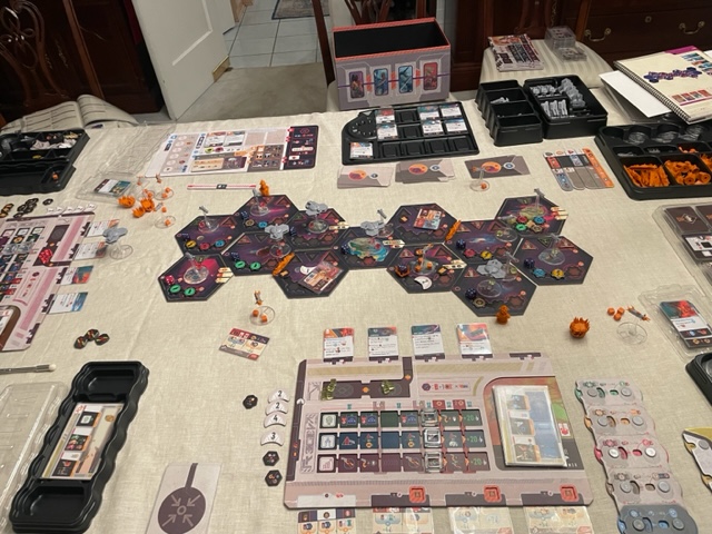 I paid the bill, said goodbye to Evan, and headed to Richard’s. We played a game I did not know, Voidfall, a new Kickstarter super premium game, $340 on Amazon, mixing space empire 4x play, and resource management. A scenario book allows setting up play for competitive, cooperative, easy to hard, and various player counts. The pieces were the best I have seen, and this game sets a new insane level of quality expectations now. There were a vast amount of rules to learn and complexity along the Lisboa or Weather Maker level, but it flowed well. There are more than ten different races and other complexities in a setup that took Richard about thirty minutes.