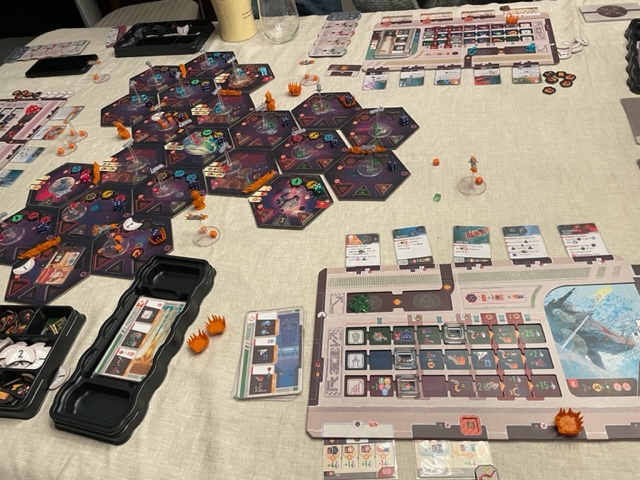 It was Kathleen, Richard, and I tonight and the board game Voidfall. This game, which I like, is a military 4X (without the one X for Exterminate, as you cannot be eliminated by rules) redressed into a worker placement game with engine-building. It has the weird technology trees you see in many 4X games, but also the point cards that you acquire and most of the points to win. I scored last as I am not very good at collecting bonus cards. I also tried to follow the military for my race, but that was not quite right as the game is worker and engine-building. Kathleen almost caught Richard, whose score was nearly double mine. Still, I like it and will try to learn the bonus card part next.