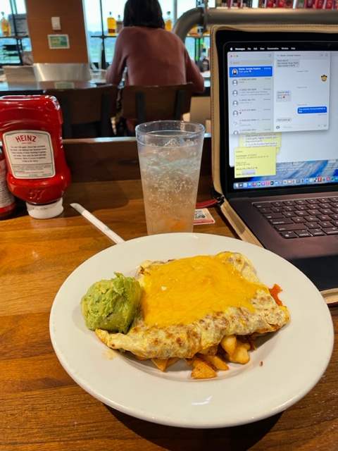 After getting my belt and shoes back on (I selected pants that fit well for today’s trip, as I did not want them to fall while they scanned me–but I did pick my nicest and loudest stripped briefs, just in case), I headed to my gate. I was headed to D, which meant a long walk down a connecting hallway (why they make these in airports is another mystery). A Mexican-style breakfast was recommended by the less-than-caring waiter in a place next to my gate. I had it with ginger ale as I had drank all the coffee at the house and in Air Volvo in an insolated cup (now safely sleeping in long-term parking). Other than a small bag of chips, that would be all the food I would get until I reached Zerida’s place.