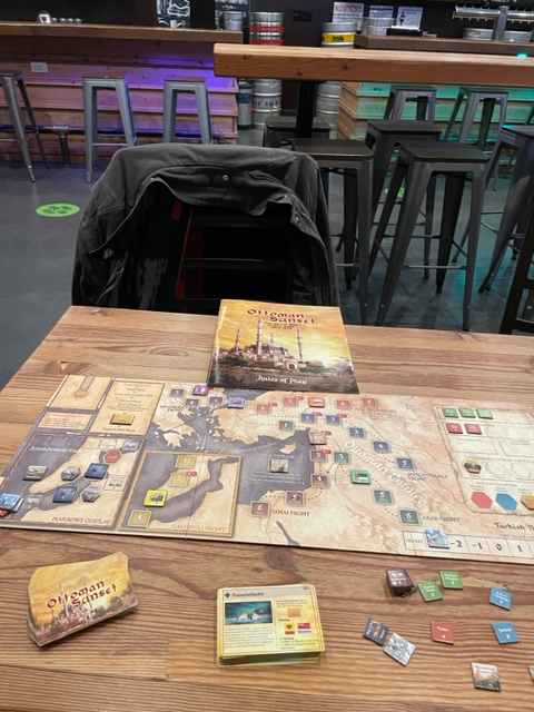 Wednesday night, I finished the blog sitting at the bar of Wildwood not far from the Volvo Cave. I had a second lighter beer, a locally made Pilsner while setting up the solo game, Ottoman Sunset. Some of my fellow beer drinkers were interested in the board game and came and looked at it after I had played it for a while. The goal was to survive the events that the Ottoman Empire (and later the Young Turks) faced from 1914 to 1918. These events are represented by a deck of cards that move threats, represented by troop markers on tracks coming closer to Istanbul. The deck has three sets of events at different times, but you must play them all to win. You can also sort them by number to repeat history in order. While the threats come closer, you have battles on other fronts to win and keep the people supporting the war. If they don’t, you repeat the fall of the Empire, just like what happened in history.