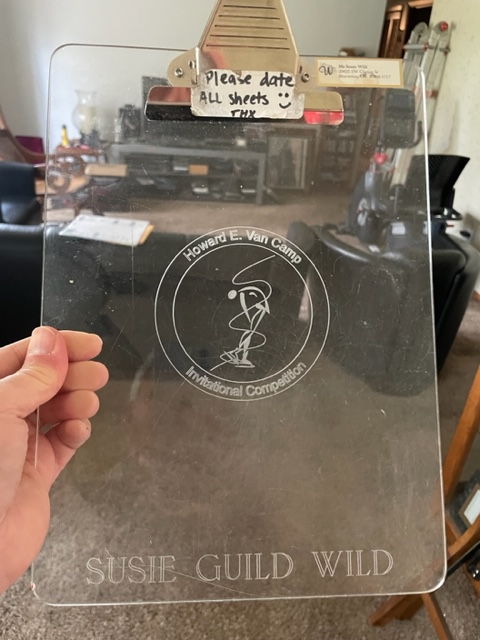 I found Susie’s own clipboard with her name on it. It was a treasured possession of hers, a gift for judging in a competition, and she always had it with her when judging. She would always use it instead of a plain clipboard. The clipboard was next to three inches of rules books in a Cambell Soup World Championship skating bag, another treasured possession. I remember Susie carrying that with her when she was judging. I kept the bag and the clipboard.
