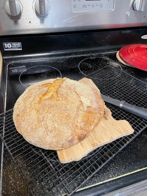 I slipped to the kitchen, pulled out the dough, pushed it around, and wrapped it. Fifteen minutes later, I set it on towels for the final rise. Now a bit floured and cornmeal-covered, I headed to the shower. I dressed and returned to more crises of the moment remotely on my Nike-owned and managed laptop. It sends a note often that something has recorded the laptop’s location–excellent. I also called Leta (but I forgot to call Grace UMC about Susie’s party optimistically planned on 18 May 2024 in Michigan), and we talked about how she is feeling and plans for her to move to a physical therapy facility. I had to suddenly ring off as another approval was pending for me. After I finished that task and with the boards clear for a moment, I headed to the kitchen.