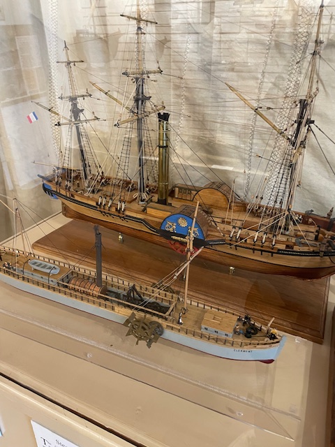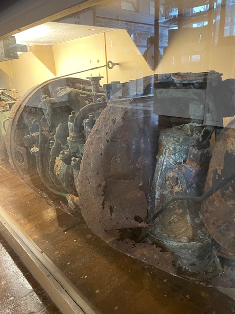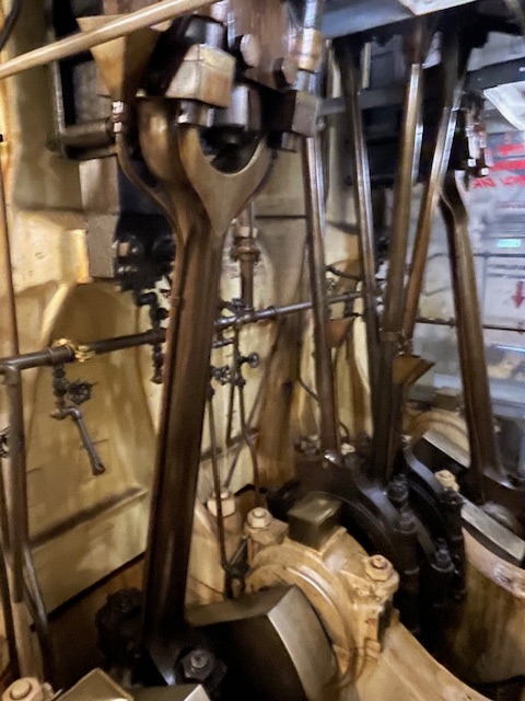 HMS Surprise‘s construction and structures made no sense to me. It appears to be a full-scale model and not really a reconstruction. For example, the two-level main gundeck deck was non-sensical for this type of warship, but it made walking easier. It was aging poorly; like most early recreations of 1800 wooden ships, the wood did not last. The Berkley was aging well. I took the steps into the engine room, a reciprocating engine like the Titanic’s and some WW1 ships. The ferry had been converted to oil and had replaced the boilers in the 1920s. The same was done to the surviving sister of Titanic, Olympic.