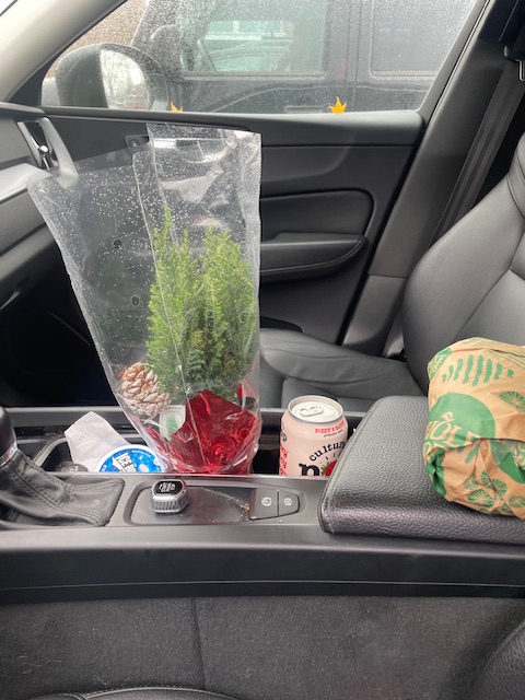 I reached Whole Foods. I like their meats and produce as they last longer and seem better than our nearby Safeway. I had actually written out a shopping list and found everything I needed and some extras. I felt strange not buying flowers for Susie, but I did find a tiny tree for myself. You can no longer accuse me of not having a tree and not having the Christmas spirit. It looks great in Air Volvo! I also got a spicy sandwich at the deli for lunch with a six grams of sugar (a teaspoon) drink (remembering my A1C). I ate most of the sandwich–it was an excellent meaty sandwich, but I will not go that way again.