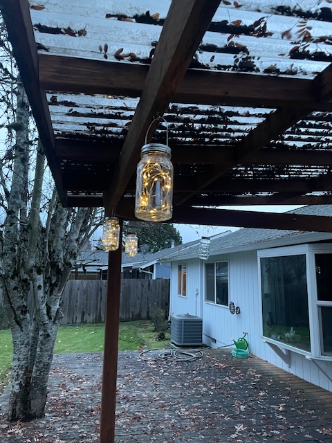 At 5ish, I made a salad for dinner (better for my A1C) with a bit of locally made no-nitrate ham, olives, and sesame sticks. I watched some more videos from The Battleship New Jersey YouTube channel. After indulging in more nautical history, I made tea, got some more chocolate mint loaf (less good for A1C but better for my mood), and wrote the blog. The fairy lights in the mason jars are lighted tonight. We have short gray days, and some of the solar cells cannot power the lights for long (the battery recharges until it is dark), but still, if you look just as it gets dark, it looks nice. In the summer, the bright sun charges them fully, and they last much of the night.