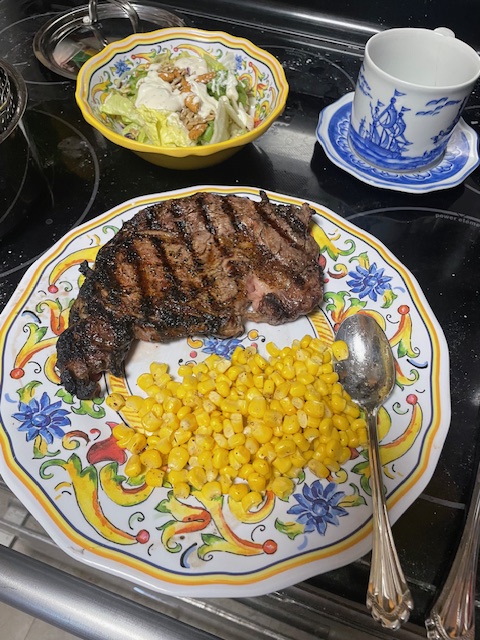 I returned, and the thin ribeye steak was an inferno. I was laughing and also trying not to burn the hair off my arms or my eyebrows, for that matter. I put out the steak. I flipped it, and it looked good with only a bit of char. I pulled it and took it inside; it was perfect–just luck and the discipline never to put anything on the grill or in the oven without a timer. The corn was ready, and I finished off the salad makings.