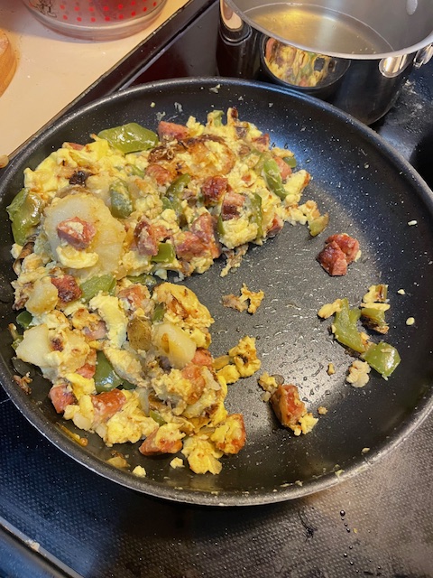 I cook some russet potatoes in boiling water. I cut up some sausage left over from making jambalaya spicy by cutting the sausage lengthwise into quarter strips and then cupping that into little chunks. I don’t do coin cuts of sausage. I find a small onion still in good form and chop half of it (Susie does not like onions, so I am used to only a hint of onions). I chop a green pepper, too. All that goes in a non-stick pan (thanks, Steve) to heat with a lid to help it cook. I am watching the other half of the movie, Midway (the new version), while cooking. I nearly burn my breakfast when the main attacks happen; the computer graphics and special effects make you feel like you are both with the American pilots and the Japanese on the ships. I pause the battle, rescue my breakfast, and add three scrambled eggs to my sausage, sliced and pre-cooked potatoes, and veggies. I managed not to burn that as the battle ended. This movie incorporates much of And I Was There by Admiral Layton, published in the 1980s, and changed our understanding of the early years of WW2 in the Pacific. In this movie, the character of Layton is a hero–an excellent improvement.
