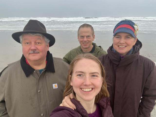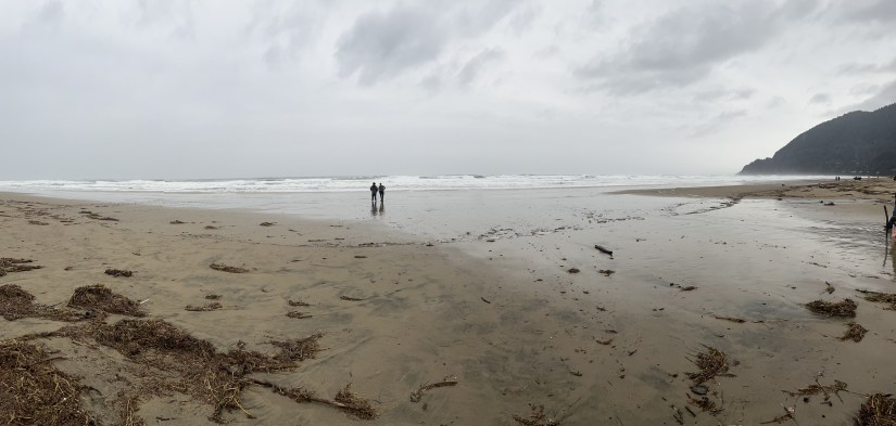 We got back into David’s tall Jeep, which had a step come out to help, but still, I found it a challenge to grab the handle, balance, and climb in. David parks the Jeep at the breach road, and we walk through some grass on a well-worn path to the beach. The sea is high with 7′ waves (that is average, not the tallest wave), and the tide is going out, showing the beach now. It is winter, and so the King tides are here, so more water comes in. The beach is the usually brown, sticky sand of Oregon (we have no issue with sand here), but the tides have removed all the shells and other jetsom flotsam I usually see. No shell to take home today.